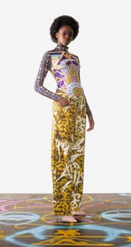 The graphic patterns adorned both garments and display elements, such as shop windows and public advertising. For instance, a display stand at Beijenkorf in Amsterdam featured the pattern. Public brand communication and presence in fashion department stores are vital for engaging the target audience and promoting the new collection. Precise technical planning ensured the patterns' effectiveness across different contexts.